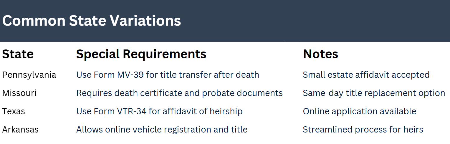 Non-Probate Transfers: Some states allow simplified transfers using affidavits or small estate procedures if the vehicle’s value is below a threshold.